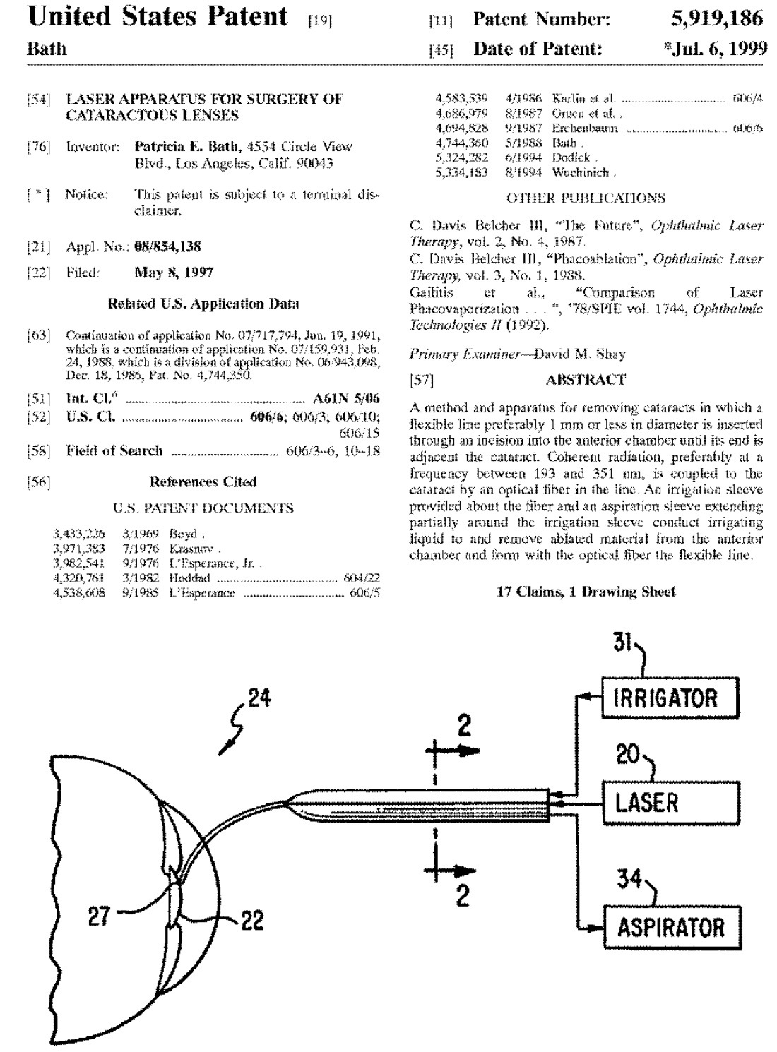 Dr. Patricia Bath was born in Harlem NY in 1942. She completed high school in TWO years and eventually made her way to Howard University Medical School. Dr. Patricia Bath was the first African American to complete a residency of ophthalmology. She was the first FEMALE faculty member in the department of ophthalmology at UCLA. She was ALSO the first African American woman to receive a medical patent. The good sis is international, laying claim to patents in Japan, Canada, and Europe. We can thank the queen of firsts for her work to advance the treatment of cataracts with her invention of the Laserphaco Probe in 1988. Dr. Baths work helped to give sight to people who had been blind for over 30 years.